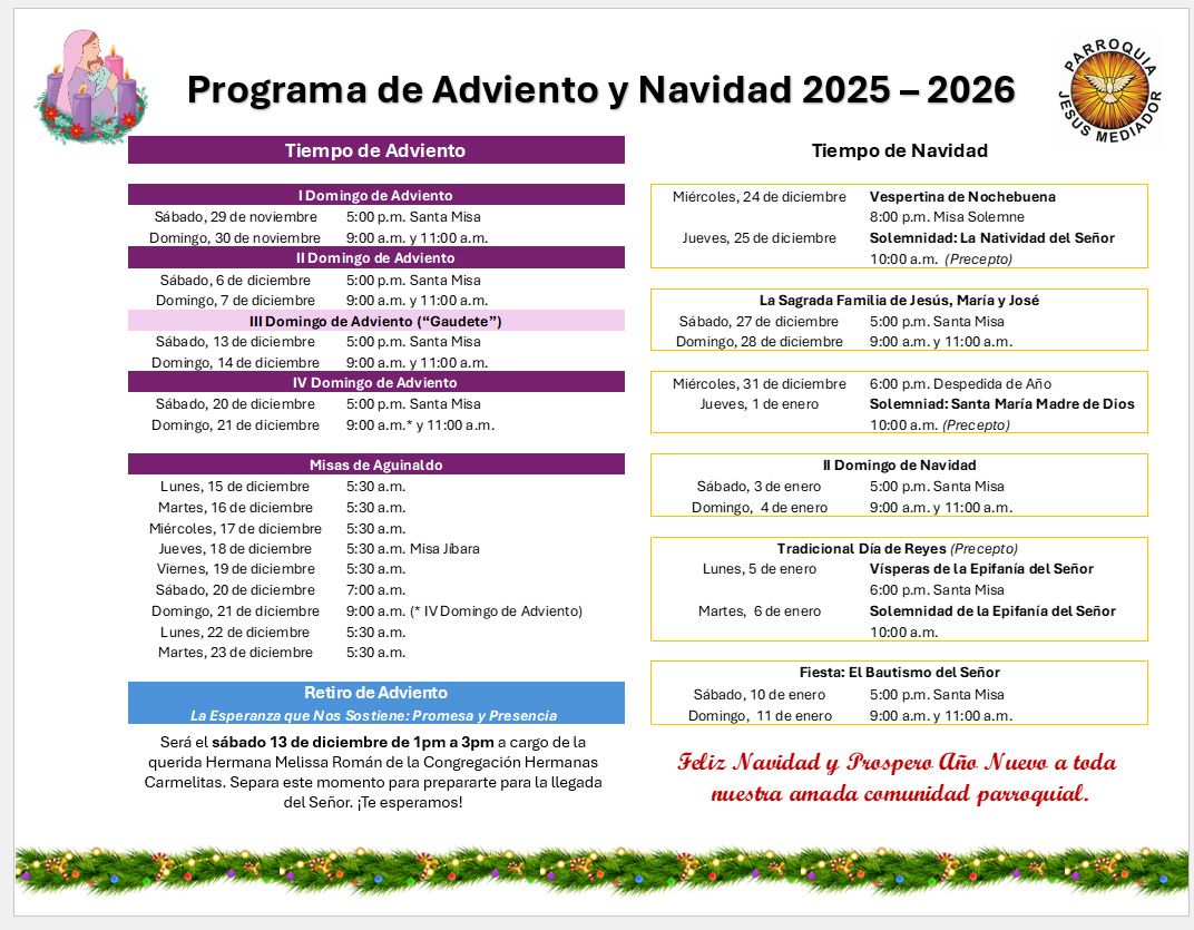 Medidas de prevención ante el brote de Influenza, la amenaza mundial del Coronavirus y otras condiciones respiratorias la Arquediócess de San Juan y el Arzobispo Mons. Roberto González recomiendan: La comunión debe recibirse en la mano. El saludo de la paz se hará mediante un gesto fraterno, evitando darse la mano o abrazo. Durante el rezo del Padre Nuestro, no se tomen las manos, mas bien unir nuestras manos en nuestro corazón en posición de oración. Use mascarillas, lávese las manos con frecuencia, use desinfectante de manos y si se siente enfermo, visite su médico y quedese en casa. Estas son medidas cautelares de prevención y provisionales hasta nuevo aviso.